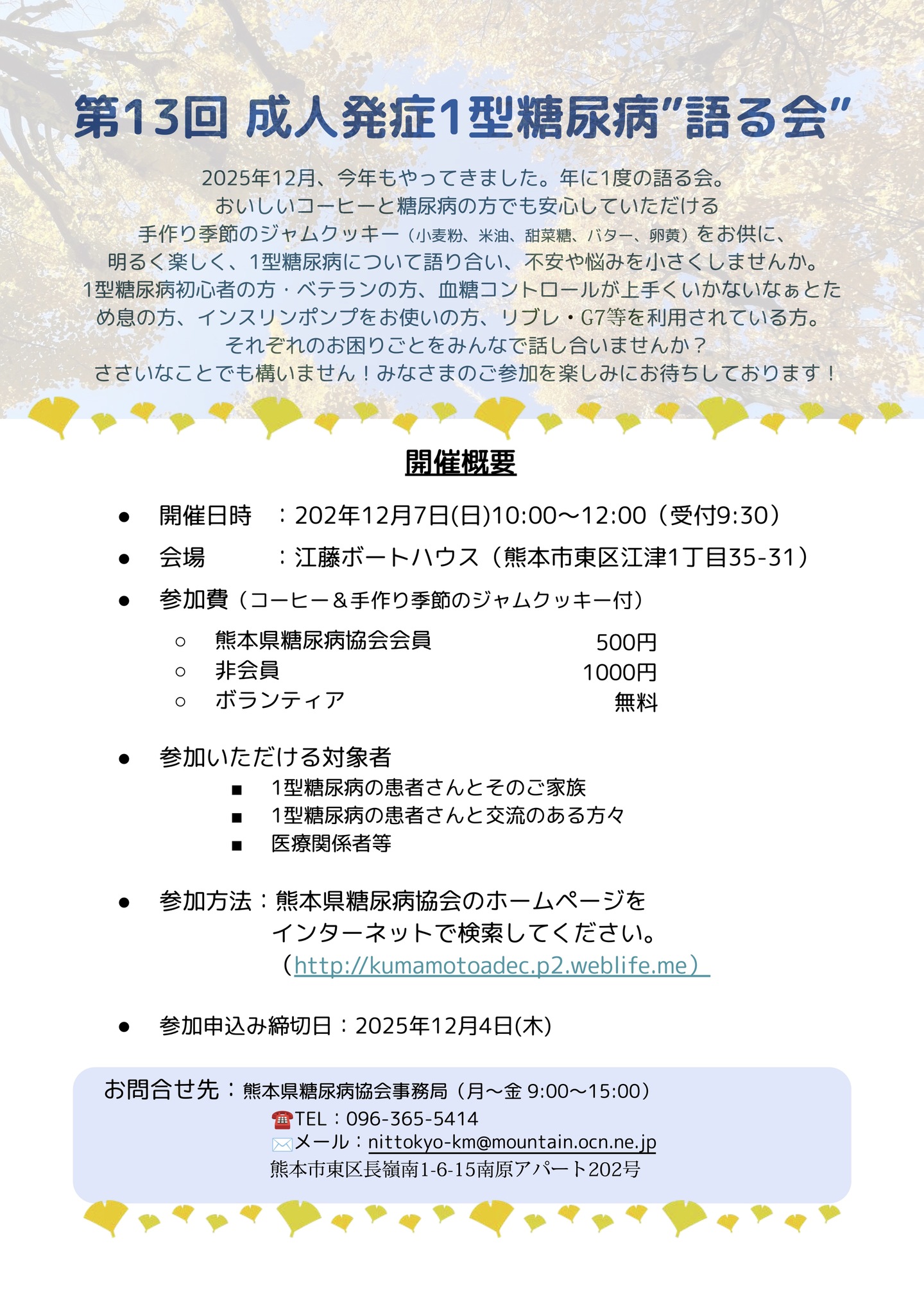 第13回 成人発症1型糖尿病”語る会” 開催のお知らせ